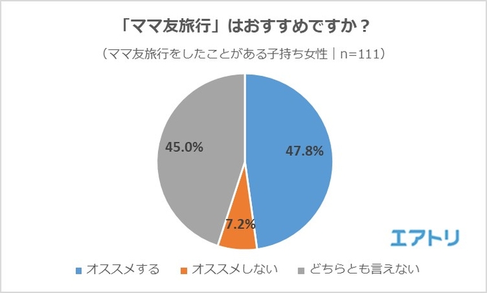 「オススメする」が47.8%と最も多くなり、「オススメしない」は7.2%に留まりました。その一方で、「どちらとも言えない」も45.0%と高い割合となりました。「どちらとも言えない」と答えた人の理由としては「気を遣う」「普段のお付き合いと一緒に泊まるのでは違う」といったものが多く、「ママ友旅行に行ったことがない」と回答した人の理由からも垣間見えたように、お付き合いが浅いママ友と一緒に旅行に行ったことで、普段とは違う一面を目にし、辟易としてしまったお母さんたちも多いことが分かりました。よって、ママ友旅行はどのママと一緒に行くかが重要なカギとなっており、気心のしれたママ友であれば助け合い、子育ての悩みも共感し合える非常に楽しい旅になる一方で、付き合いの浅いママ友とだと思いがけない本性を見てしまい、疲労も倍増してしまうことがあるようです。