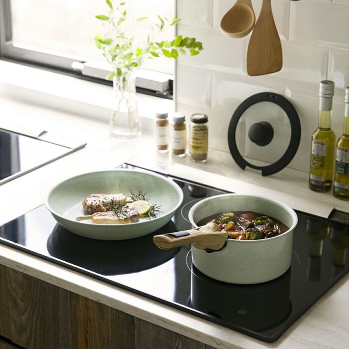 熱伝導率のよさとヒスイ&セラミックのW遠赤外線効果で素材の中まで熱が伝わりやすく手早くおいしくエコ調理。