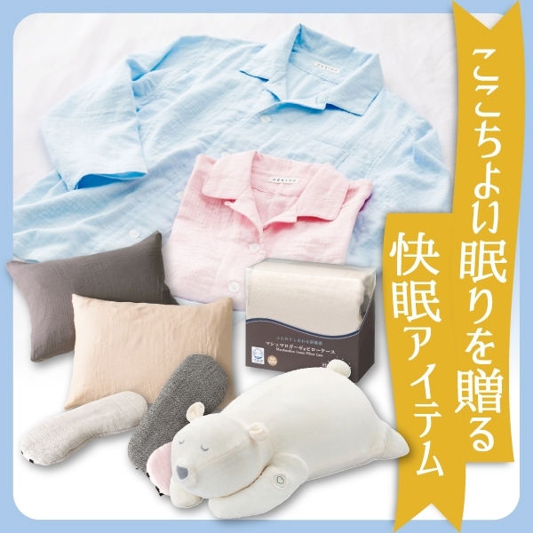 やわらかでやさしい肌ざわりと吸水性、保温性、通気性を兼ね備えた「マシュマロガーゼパジャマ」、音・香り・光で快適な眠りを誘う「スリーピオン3 快眠サウンド」、入眠に最適な呼吸のリズムをガイドする「ルルド おやすみグースピー」などを掲載しています。