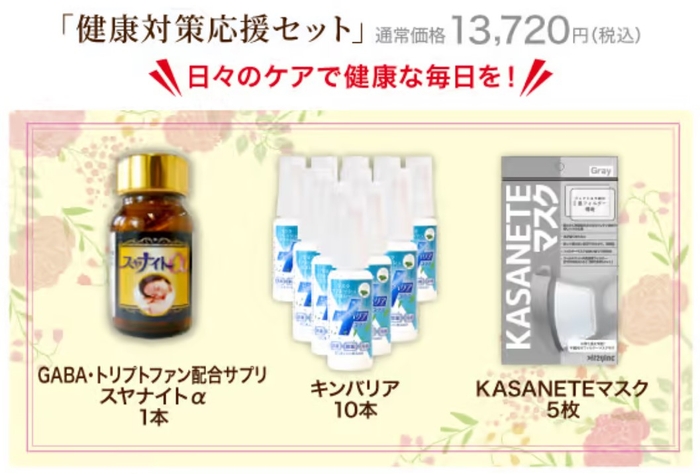 寝具だけでなく、快眠サポートサプリ「スヤナイトα」で体内から良質な睡眠をサポート!リラックス成分と睡眠サポート成分で、自然な眠りに導き、睡眠の質を高めます。さらに昨今必需品となったマスクとマスクリフレッシュスプレーもセットでご用意しました。
