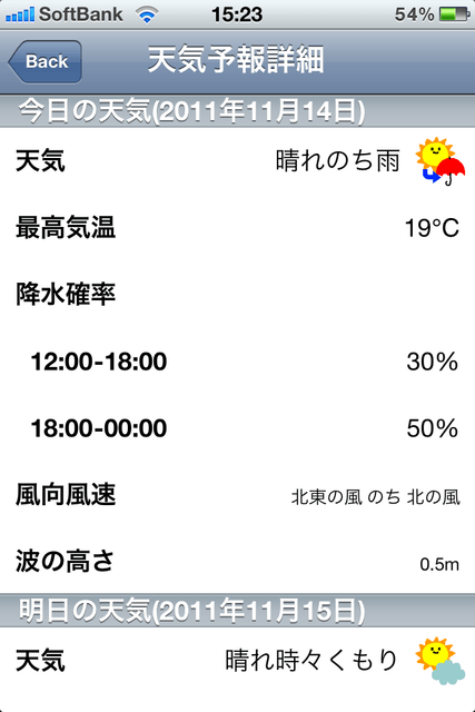 3.今日・明日の天気では、天気、気温、降水確率、風向風速、波の高さが見られます!