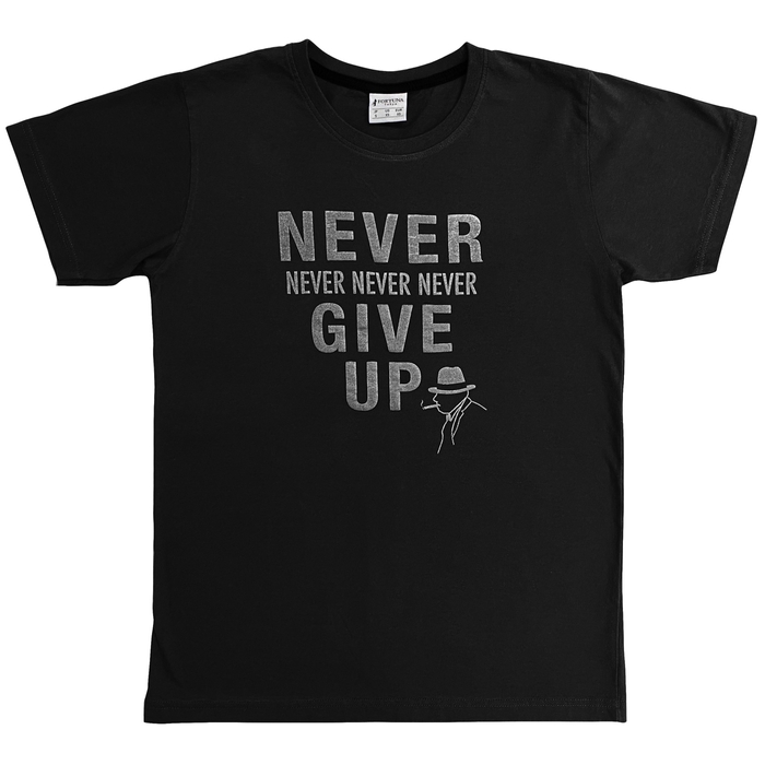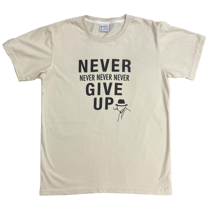 「Never give up」はブラック、ブルー、リネンの3カラーで登場。第2次大戦時ヨーロッパ最後の砦として踏みとどまった元イギリス首相ウィンストン・チャーチルの名言をデザイン化した。その頑強なまでのメッセージは色あせぬ響きをもって、コロナ禍にあえぐ現代に共鳴する。