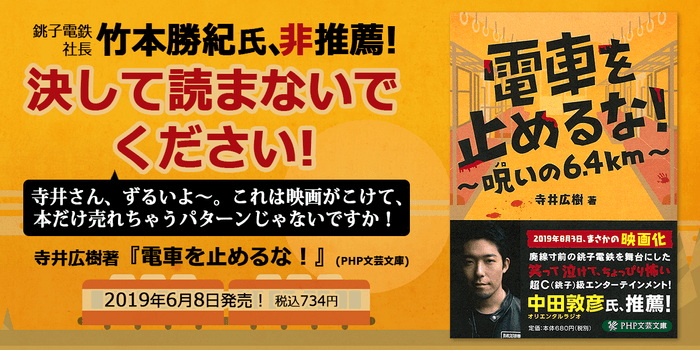 株式会社PHP研究所(京都市南区・代表取締役社長 清水卓智)は、千葉県のローカル鉄道「銚子電鉄」を舞台にした小説『電車を止めるな!――呪いの6.4Km』(PHP文芸文庫/680円税別)を、2019年6月8日に発売いたしました。銚子電鉄が製作中の同名映画(2019年8月公開予定)の原作となる、笑って泣けて、ちょっぴり怖い超C(銚子)級エンターテインメントホラー小説です。