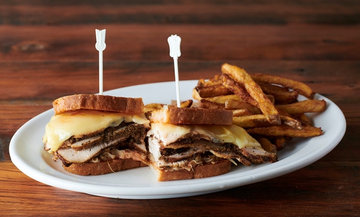 ハーブやスパイスに漬け込んだターキーを薫り高くスモークしザワークラウト&スイスチーズをのせてカンパーニュブレッドでサンド