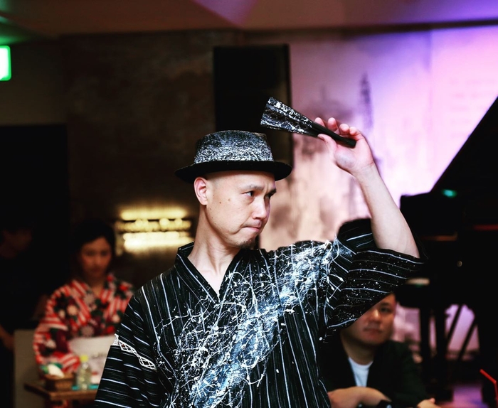 2月8日の実演ライブでは、音楽の鼓動を感じながら創作したいと望む作家の要望で、宝塚市で大人から子供まで活動する和太鼓集団「熱光」の迫力ある演奏