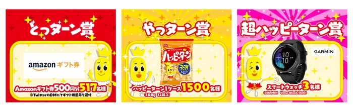 ※ハッピーターン公式 Twitter アカウント(@happyturnkameda)をフォローの上、ゲームプレイ後に表示される応募ページ内に記載の応募方法にしたがってTwitterでツイートして応募ください。