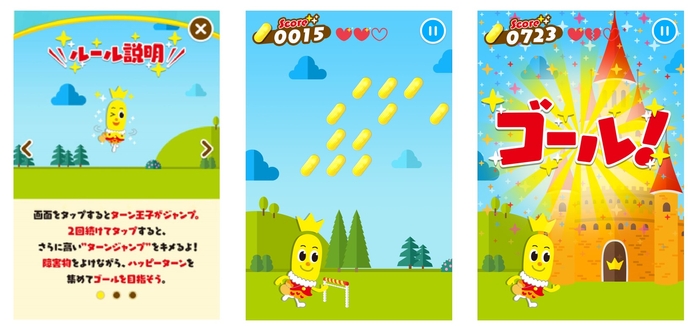 「走れ!ターン王子」は家にいながらでもスマートフォンで楽しめるオンラインゲームです。画面をタップすることでターン王子を「ジャンプ」させ、障害物に当たらないようにゴールを目指します。簡単な操作と軽快な音楽とともに走るターン王子の可愛さで、小さなお子さんとでもご一緒に楽しめます。