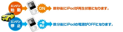 1.自動車のエンジン始動時にiPodの電源がONになります。