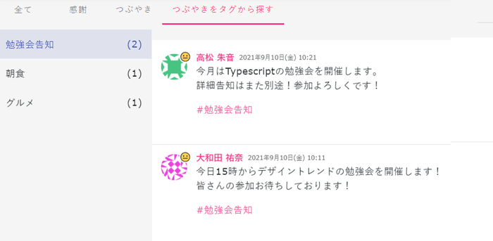 「#質問」「#営業部」「#ゲーム好き」など欲しい情報を素早くキャッチし、より社員同士コミュニケーションを深める効果が期待できます。
