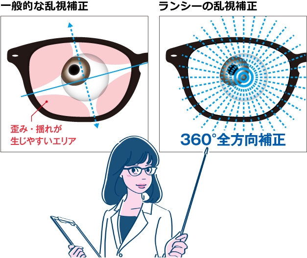 一般的な乱視補正は、2 軸方向のみを補正。斜め方向やレンズ周辺を見たときに、実際の乱視軸との間にズレが生じ、歪み・揺れが残ります。ランシーは、あなたの視線の動きに合わせた360°全方向補正。だから、レンズの隅々まで歪みを抑えたクリアな視界が広がります。