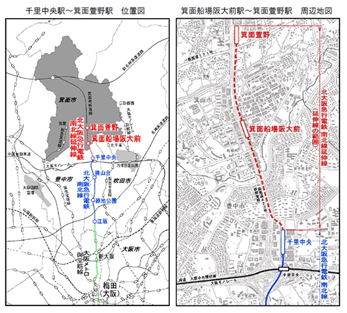「北大阪急行電鉄南北線延伸線」は、江坂駅から千里中央駅まで運行している北大阪急行電鉄南北線を、千里中央駅から北へ約2.5km延伸し、「箕面船場阪大前駅」と「箕面萱野駅」の2駅を新設する路線であり、整備主体である箕面市と北大阪急行電鉄が2016年度より工事に着手し、安全対策に万全を期しながら工事を進めています。