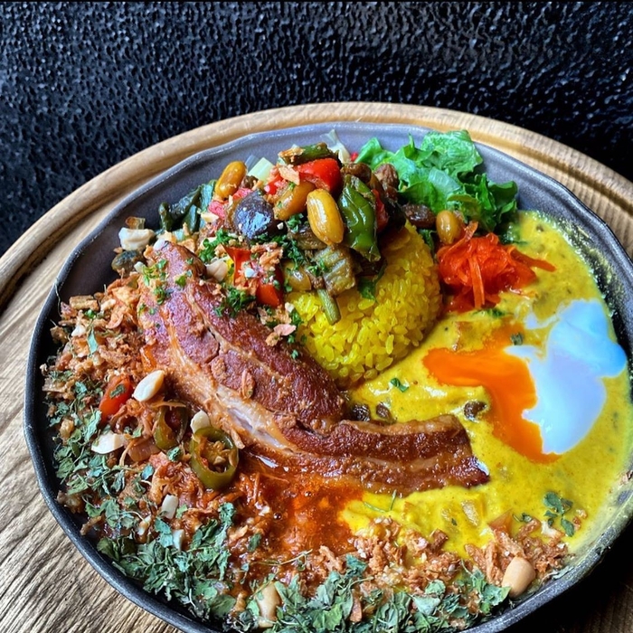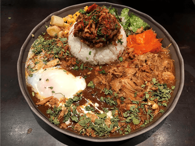 古くからの友人であり、長きに渡り飲食店を経営されていた瀬良さんとカレー作りを趣味として続けてきた清水さんが意気投合し極哩のカレーは生みだされました。カレーを作るのが好きな清水さんと盛り付けが異常なほど得意な瀬良さん。この2人のチームワークが極哩のカレーの最大の特徴であり個性です。繊細なスパイスの調合と旨味を引き出す素材のチョイスに加え、デコレーションアートの様な食材のアレンジメントは簡単には真似ができないセンスが光ります。