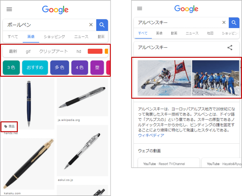 ※Googleモバイル検索(www.google.co.jp)にて「ボールペン」での画像検索結果(左)と、