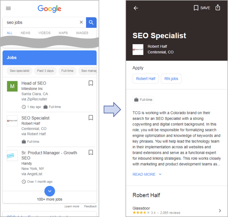 「seo jobs」の検索結果でのGoogle for Jobs の表示例(2018年1月11日時点)(添付画像参照)