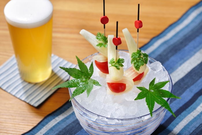 界が開発したオリジナルの「至福の湯上がりビール」を、中庭に青々と広がる「つむぎ茶畑」にて提供します。ピンチョススタイルにした浜松を代表する漬物野菜「子メロン」、国内生産量1位の「エシャレット」、静岡生まれの「アメーラトマト」と共に、浜名湖から吹く風を感じながら湯涼みができます。