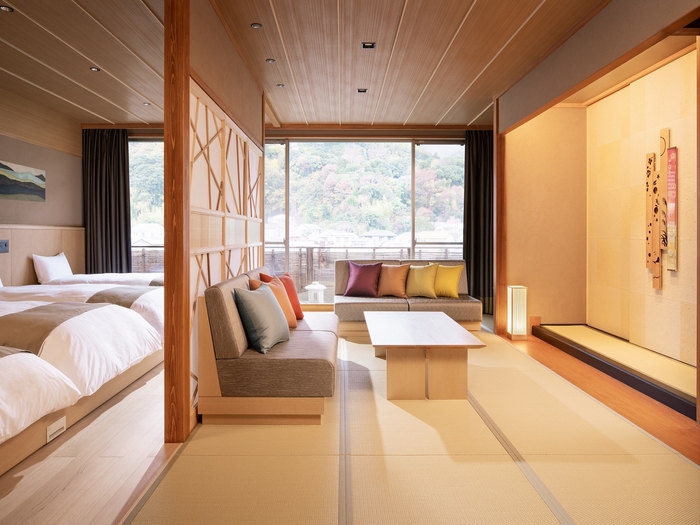 客室すべてが、伊豆の四季を草花で表現しデザインされたご当地部屋「伊豆花暦の間」です。客室入口は、二十四節気の中でその季節のはじまりを表現した「木漏れ日行灯」がお出迎え。室内では、床の間に飾ったその季節を象徴する生花や、室内から見える中庭の景色で体感。年間を通して生息する草花や木の枝から染め上げた糸を使い、四季を草花などで表現した「花暦スクリーン」を用意。室内で伊豆の四季を感じられる客室です。