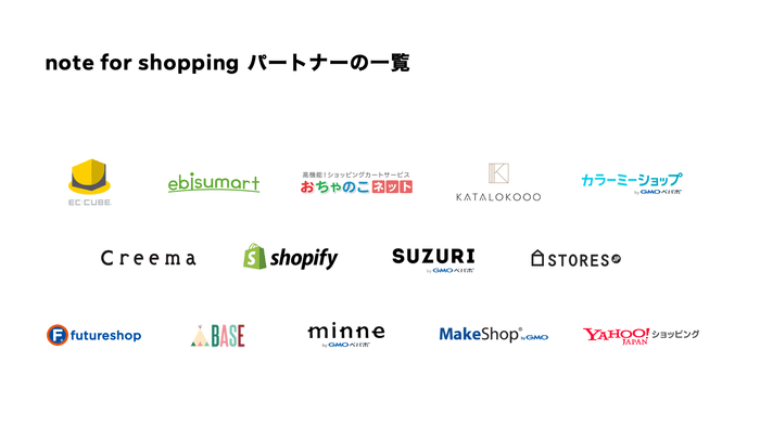 note for shoppingのパートナーに、Shopifyが加わりました。クリエイターがファンを増やすためにnoteで商品や開発背景を紹介するときに、商品ページの表示をしやすくするための仕組みとして2018年9月にはじまったnote for shopping。ECプラットフォームのパートナーは12社14サービス(EC-CUBE / ebisumart / おちゃのこネット / KATALOKooo / カラーミーショップ / Creema / Shopify / SUZURI / STORES.jp / futureshop / BASE / minne / MakeShop / Yahoo!ショッピング)に拡大しています。