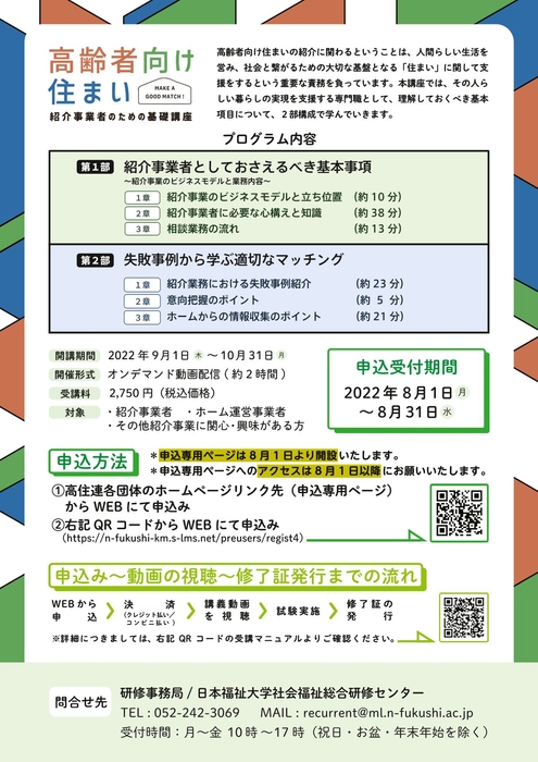 今後は、受講状況を地域関係機関等への周知することで、高齢者向け住まい紹介事業における「相談の質の向上」へむけた取組みを案内していく予定です。