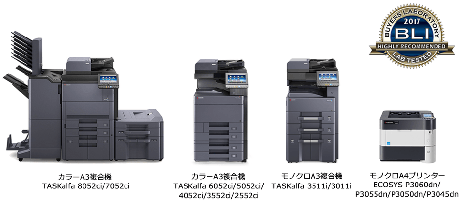 京セラ株式会社の関連会社である京セラドキュメントソリューションズ株式会社(社長:伊奈 憲彦)は、ドキュメント機器に関する独立調査機関である米国Buyers Lab(以下、BLI)より、カラーA3複合機TASKalfa 8052ci/7052ci/6052ci/5052ci/4052ci/ 3552ci/2552ciと、モノクロA3複合機TASKalfa 3511i/3011i、モノクロA4プリンターECOSYS P3060dn/P3055dn/P3050dn /P3045dnが「Highly Recommended」に認定されたことをお知らせします。