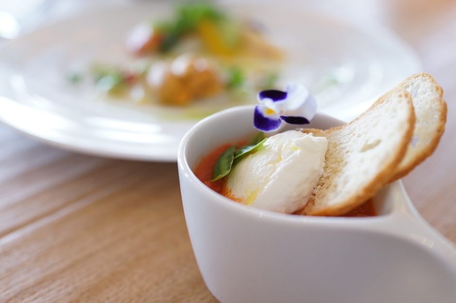 ホイップクリームのような愛らしい玉ねぎの泡のせ、牛ミルクのチーズやココナッツミルクの隠し味、天然鯛には漢方栽培の米粉ポレンタ(※)やキャビアを添えて…