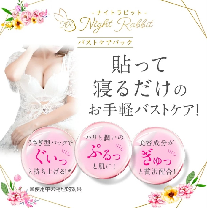 ハリ成分“ボルフィリン”や“エラスチン”だけではなく、こだわりの美容成分がたっぷり凝縮しています。「バストにハリがない」「ツヤ・弾力が低下してきた」と感じるお肌も、ナイトラビットを貼るだけで簡単にもっちりとした美しいお肌が手に入ります。保湿のスペシャルケアが手に入るこの機会にぜひお買い求めください。