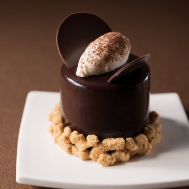 濃厚なチョコレートムースの中にダックワーズ生地とカラメルブリュレをしのばせて、グラサージュでコーティング。