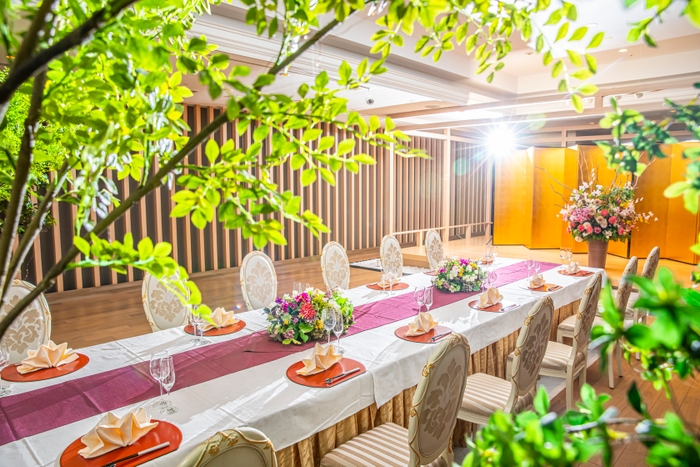 お食事は、御影石の重厚感と、木や竹を基調にした和の趣が感じられ、まるで京都の祇園に来たかのような落ち着いた雰囲気の会場「結」にてご案内。檜の舞台上には、日本の伝統文化である着物の展示、水引つるし飾りや、和柄の円柱オブジェなど、風情のある空間が広がります。