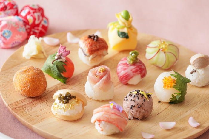 洗練された和の空間で、一品一品丁寧に作り上げられた、和と洋の彩り豊かな手毬寿しの数々をお愉しみください。