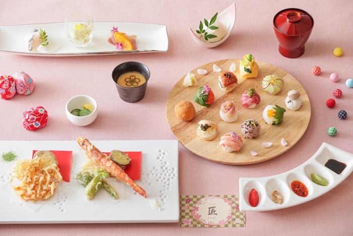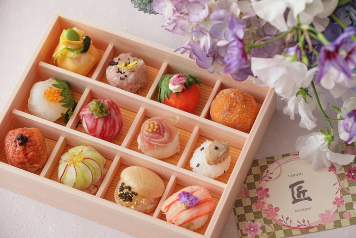 四季折々の食材を使い、熟練の技から生み出されるメニューの数々が楽しめる「TAKUMI 会席」 で、2021年4月1日(木)~6月30日(水)期間中、特定日限定で『祝手毬~JUNI‐HITOE御膳・弁当~ 』を販売いたします。