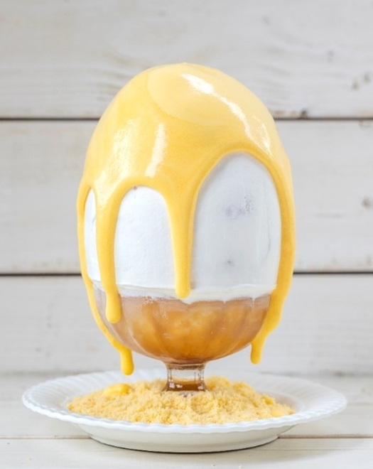 たまご型にととのえたミルク氷の中には季節のフルーツが5種類とキャラメルマンゴーソースが入っており、さらに、たまごソースも隠れています。コクのあるソースは氷との相性が抜群です。外側はレモン風味のメレンゲで仕上げて最後はお客様目の前でブリュレをすることで香ばしいかき氷のできあがり。食べる前からお楽しみいただけるエンターテイメントかき氷です。