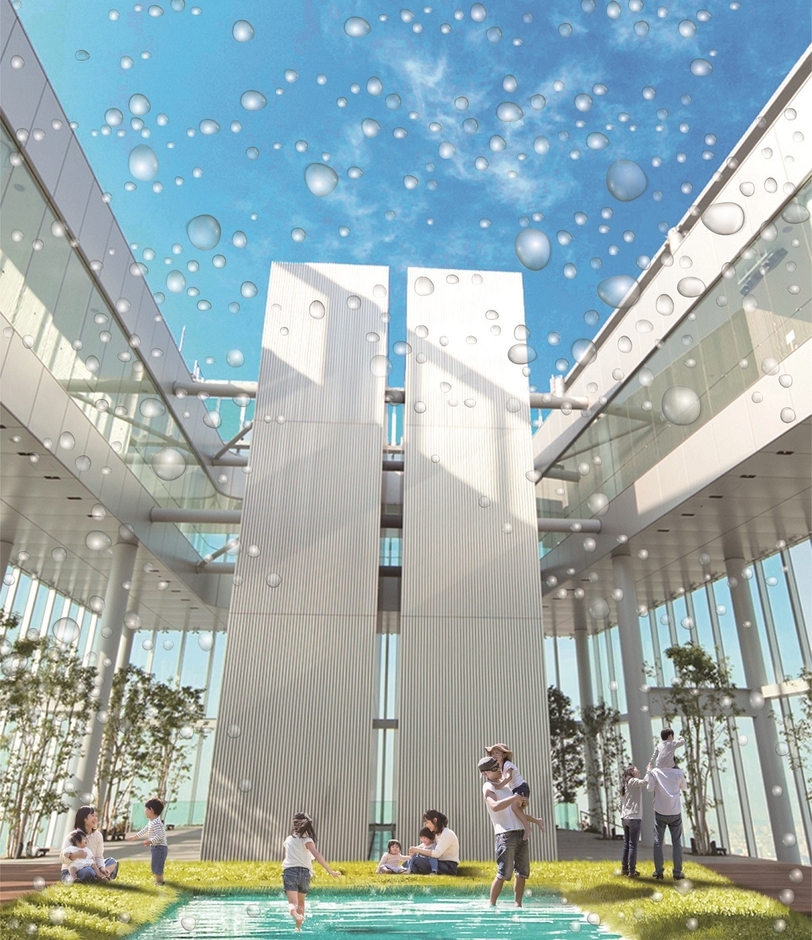 本イベントは、「涼」をテーマに、水場と人工芝からなる広さ約70平方メートルの「涼感エリア」を58階の天空庭園に設置します。ハルカス300(展望台)は、約300mの高さに位置するため、地上より気温が約2℃(※1)低くなると言われており、オープンエアの空間で夏の空気を味わいながら、約300mからの絶景と水場の涼しさを感じられる、「日本一高いビルのオアシス」として、皆様にお楽しみいただければと考えています。