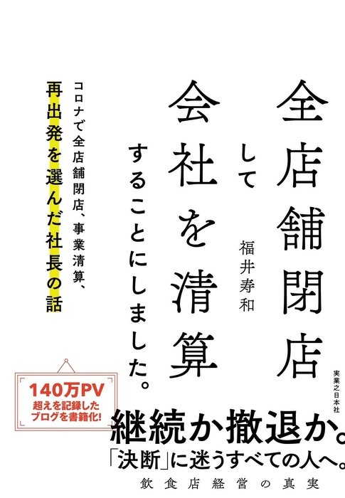 メディアプラットフォームnoteに投稿された、福井寿和さんの記事「全店舗閉店して会社を清算することに決めました」が『全店舗閉店して会社を清算することにしました。コロナで全店舗閉店、事業清算、再出発を選んだ社長の話』として、実業之日本社から11月2日に発売されます。決断に迷う人へ勇気をくれる一冊です。本書はnoteの記事に、大幅に書き下ろしを加え構成されています。
