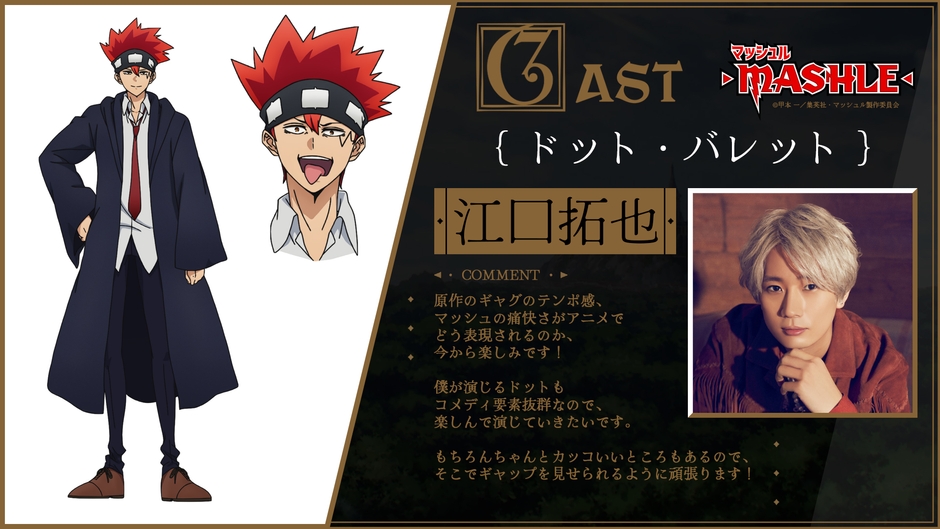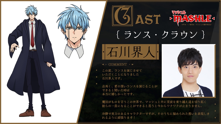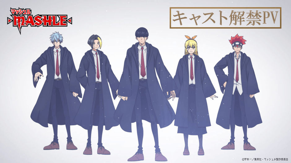 すでに解禁済みの主人公マッシュ・バーンデッド役小林千晃に加え、フィン・エイムズ役に川島零士、ランス・クラウン役に石川界人、ドット・バレット役に江口拓也、レモン・アーヴィン役に上田麗奈と、今勢いに乗っている豪華キャストが集結︕