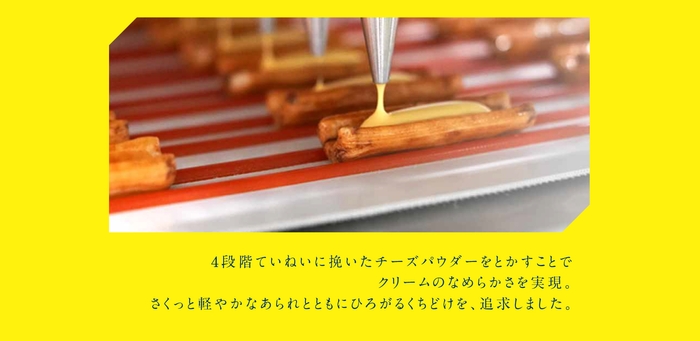 チェダーとゴーダの2種類のチーズをブレンドすることで、濃厚な美味しさを実現。さらに、ていねいに4度挽いたチーズパウダーをとかすことで、なめらかなクリームに。