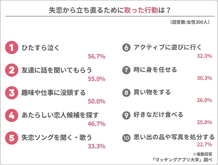 300人の失恋経験者の皆さんに、失恋から立ち直るために取った行動を聞いてみました。結果は次の通り。