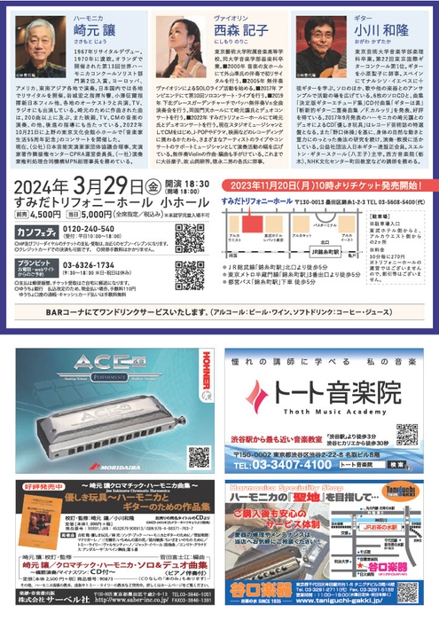 プランピットでは、「時ノ空間」というテーマで過去10回にわたり楽器のもつ素晴らしい響きをデュオ・トリオといった編成で企画してまいりました。今回は、「ハーモニカ」と「ヴァイオリン」そして「ギター」というトリオで演奏いたします。クラッシックをハーモニカで演奏?と思われている方に是非一度は、聴いていただきたいコンサートです。 ハーモニカを他の楽器と肩を並べることができる表現を持った演奏することを掲げられ音楽家生活55年以上活躍されている日本を代表するアーティスト崎元讓さんを中心に今回はハーモニカの他にヴァイオリンそしてギターを加えたトリオの演奏です。