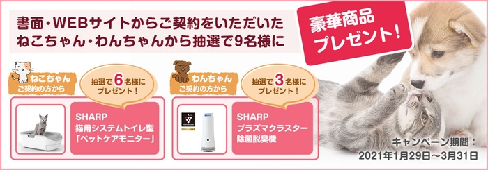 この度、書面・WEBサイトからご契約をいただいたねこちゃん・わんちゃん限定で 豪華賞品を抽選で9名様にプレゼントいたします。