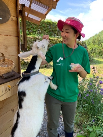 下:農場の人気者トカラヤギのうし君(左)とお母さん代わりのスタッフ