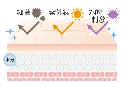 健康な肌の角質細胞の間はセラミドがみっちりとすきまを埋め、水分を保っています。これが外部からのさまざまな刺激から体をまもる「皮膚のバリア機能」の要です。