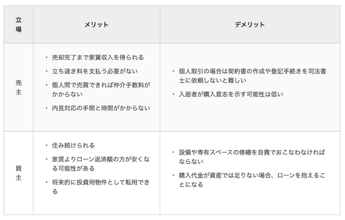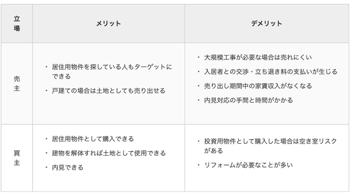 売主にとっては、売却活動期間中も家賃収入を得られるのがメリットです。投資用物件を探している買主にとっては、購入時点での空き室リスクがないことがメリットといえます。