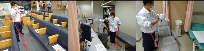 十三市民病院は、2020年4月27日より一般外来を一旦休止し、新型コロナウイルス感染症患者の入院受入を行う重点医療機関として、中等症の入院患者の対応にのみ専念してこられましたが、2020年7月27日から産科を除いた一般外来を再開。ホープハウスシステムによる抗菌バリアコーティング「eco光ガード」の吹き付け施工を再開前の3日間にわたって行いました。