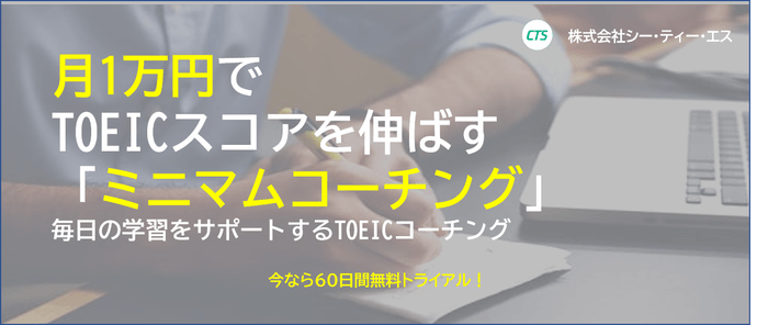 企業向け英語研修の株式会社シー・ティー・エス(本社:大阪府大阪市北区、代表取締役:岩名 葵、以下、CTS)は、TOEIC®を昇格要件としている企業のビジネスパーソン向けに、1か月1万円でパーソナルコーチングを受けることができる「ミニマムコーチング」の提供を開始致しました。「ミニマムコーチング」とは、専属コーチが受講生の目標に合わせて、面談とチャットで日々の学習サポートを行うサービスです。