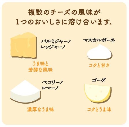 ・4種類のナチュラルチーズに、生クリームが溶け込んだ濃厚なうま味とコクが楽しめます。
