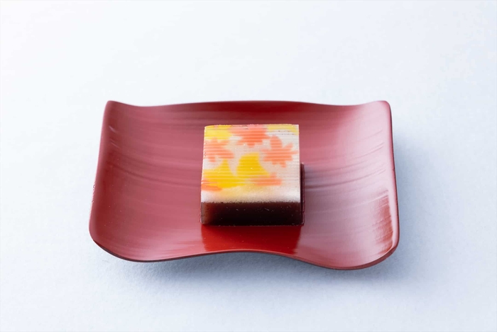 屋形舟の中では自分で点てる抹茶とともに、目の前の景色を映した和菓子を味わいます。和菓子は1803年創業の和菓子店「亀屋良長」が本アクティビティのために手がけたものです。色づく紅葉とイチョウを羊羹(ようかん)の中に閉じ込め、静かな川面を舟が進むときのさざ波を、表面の筋で表しています。抹茶は京都府・宇治の「利招園茶舗(りしょうえんちゃほ)」が、星のや京都のために茶葉を厳選し、挽いたものです。茶の一服が旅の「記録」になるようにとの思いと、大堰川の澄んだみどり色にちなみ、「録碧(ろくへき)」と名付けられています。