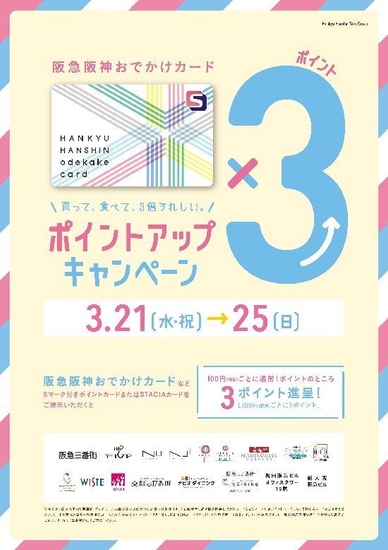 期間中、阪急阪神おでかけカード加盟店でご利用100円(税抜)毎に、通常1ポイントのところ3ポイント進呈いたします。