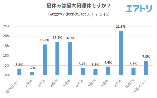 就業中の人に今年の夏休みは最大何連休かを聞いたところ、最多は「9 連休」(22.8%)となり、続いて「4 連休」が17.1%、「5 連休」が16.9%となりました。未だ外出自粛をせざるを得ない状況下での夏の連休の過ごし方は、工夫が必要になりそうです。