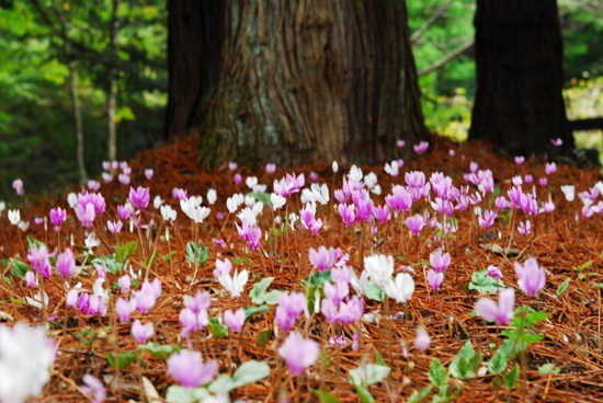 フランス、イタリア、ギリシャなどヨーロッパの地域が原産とされるシクラメンは、本格的な秋の訪れとともに白やピンクの小さい花を咲かせます。その控えめな様子から、「はにかみ」「内気」といった花言葉をもっていますが、花期が長く、木陰に密集して開花するため、当園では見ごたえのある群生となっています。一面に広がるシクラメンはインスタグラムをはじめとするSNSでも良く映えます。