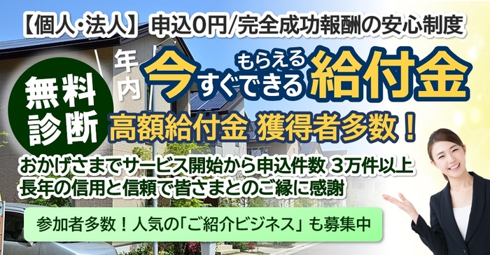 【建物の給付金】補助金・助成金よりも早い高額受給!まだまだ申請可! 着手金0円/無料診断!全国各エリア受付中