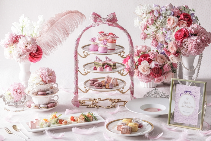 “マリー・アントワネットが日本の春の美しさに魅了されたら?”ファッションリーダーであり新しく可愛いものを追い求めていたフランス王妃“マリー・アントワネット”を華やかなアフタヌーンティーで表現。洋菓子特有の美しく繊細なデザインでありながら、“あんこ”や“白ごま”など和菓子のエッセンスを巧みに取り入れたテイスト“ジャポネ クチュール(日本仕立て)” を創造しパティシエが考案。