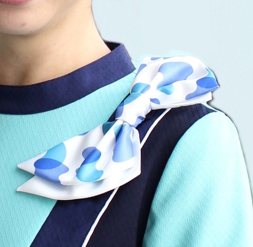 首元には紺のスタンドカラーを付けることで、全体が締まり程よくフォーマル感を出し、スカーフにはあべのハルカス美術館のロゴをあしらい顔周りに華やかさを添えました。